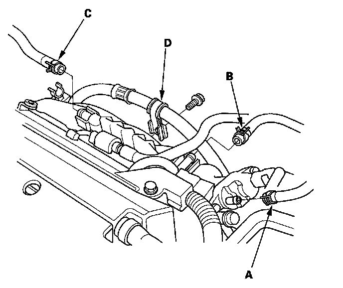 5. Remove the evaporative emission (EVAP) canister hose (A), brake booster vacuum hose (B), positive crankcase ventilation (PCV) hose (C), and power steering (P/S) hose clamp (D).