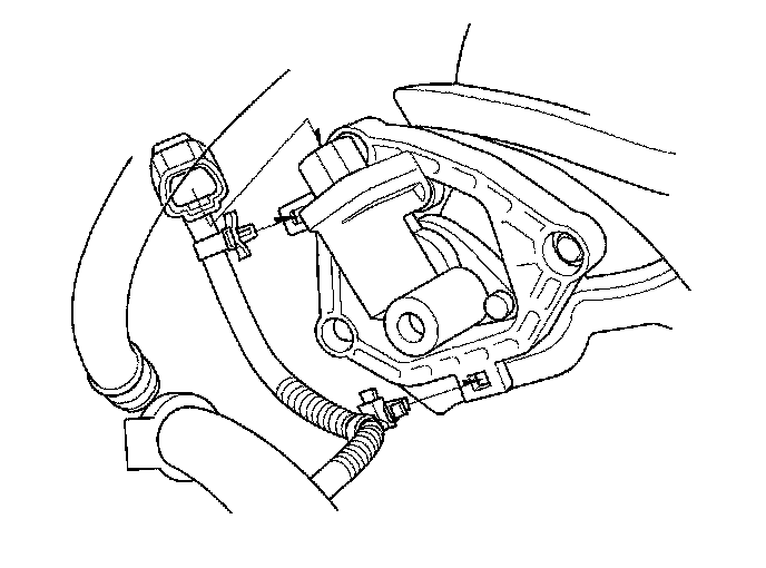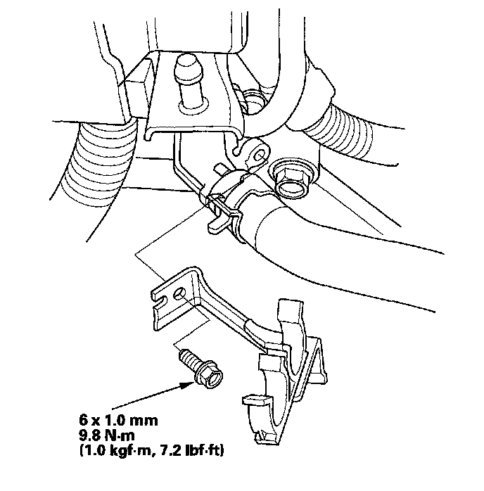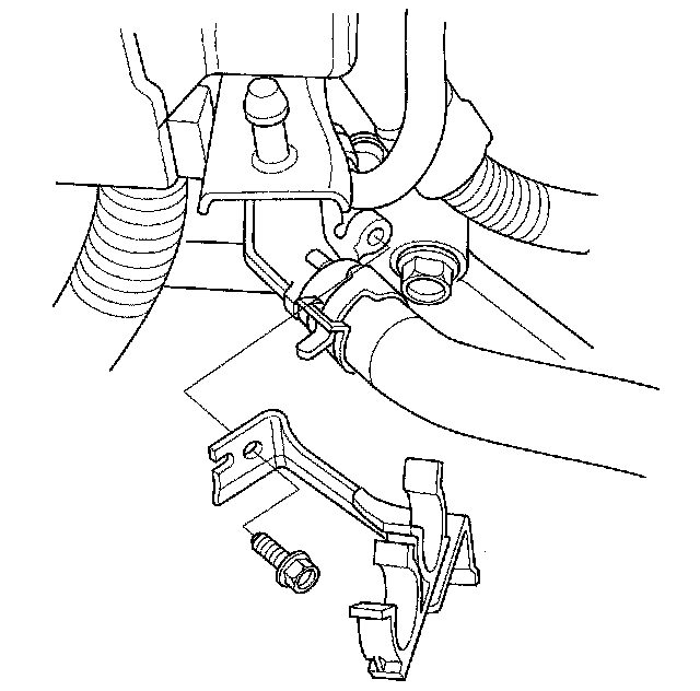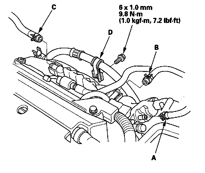 11. Install the evaporative emission (EVAP) canister hose (A), brake booster vacuum hose (B), positive crankcase ventilation (PCV) hose (C), and power steering (P/S) hose clamp (D).