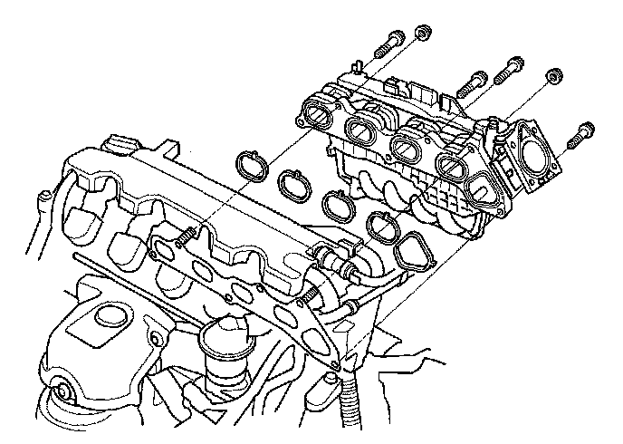 14. Remove the all intake manifold mounting bolts and nuts, then remove the intake manifold from the cylinder head.