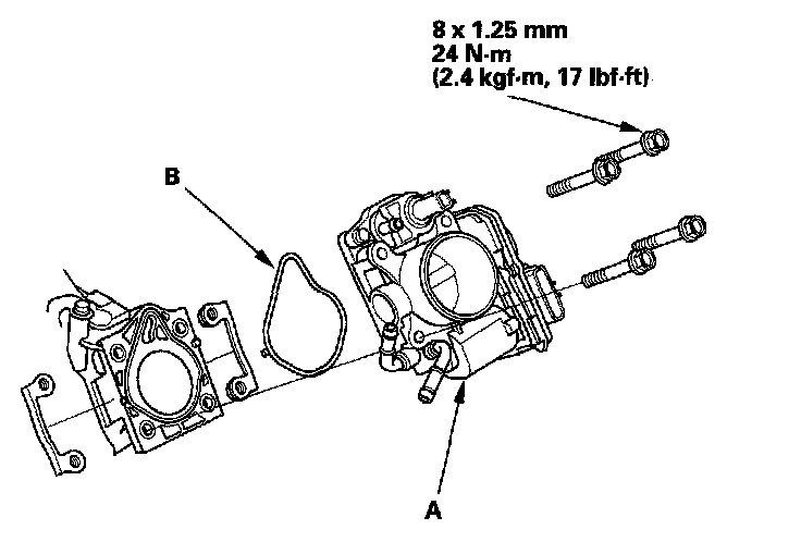 2. Install the intake manifold (A) with new gaskets (B), and tighten the bolts and nuts in a crisscross pattern in two or three steps, beginning with the inner bolt.