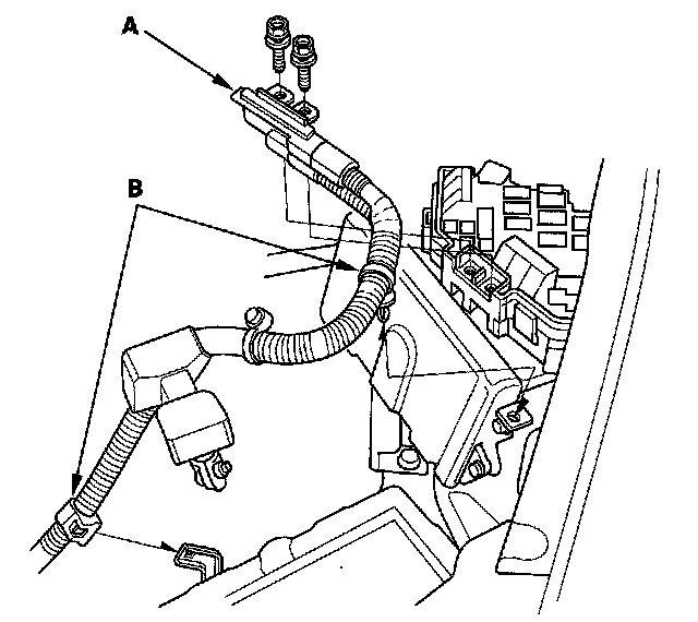 11. Remove the battery cables (A) from the under-hood fuse/relay box.