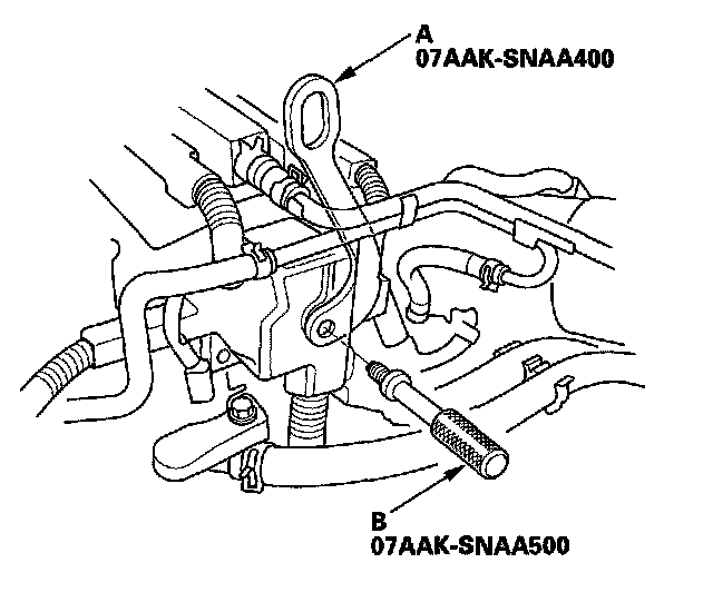54. Attach a chain hoist (A) to the special tool (B) and transmission hook (C). Lift up on the engine/transmission until it's securely supported by the chain hoist, and remove the engine support hanger from the engine and vehicle.