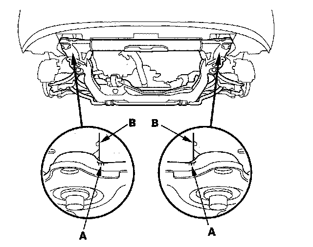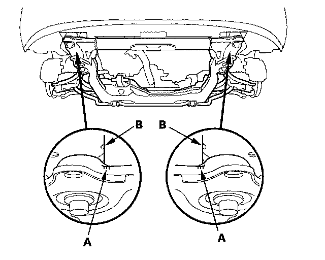 47. Note the reference marks (A) on both sides of the front subframe that line up with the body (B).