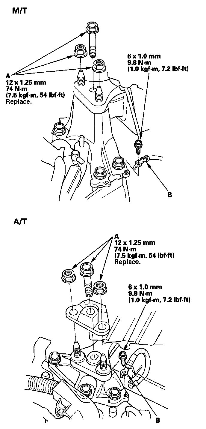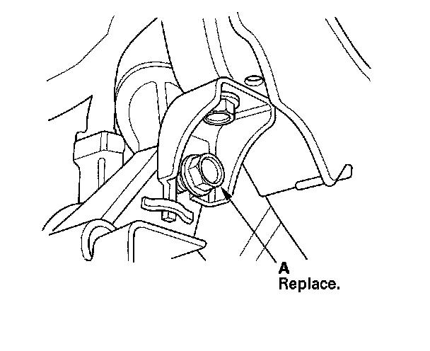 8. Tighten the new transmission mounting bolt and nuts (A).
