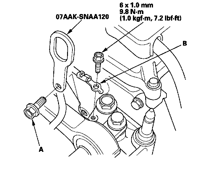 16. M/T model: Remove the two bolts (A) securing the harness holder, then remove the harness clamp (B).