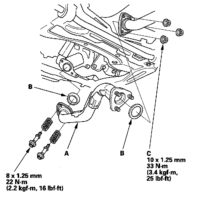 13. Align the front subframe reference marks (A) to the body (B), as noted during removal. Tighten the subframe mounting bolts to the specified torque.