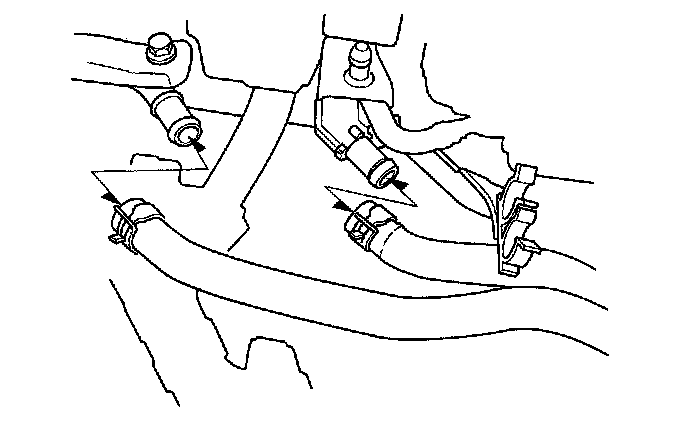 10. Remove the evaporative emission (EVAP) canister hose (A), brake booster vacuum hose (B), and power steering (P/S) hose clamp (C).