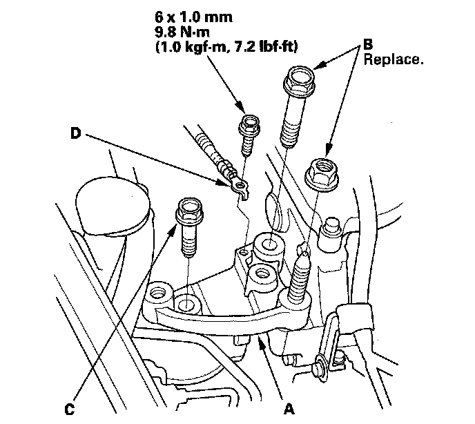 15. Install the side engine mount bracket (A), then loosely tighten the new bolt and nut (B), and loosely tighten the bolt (C).