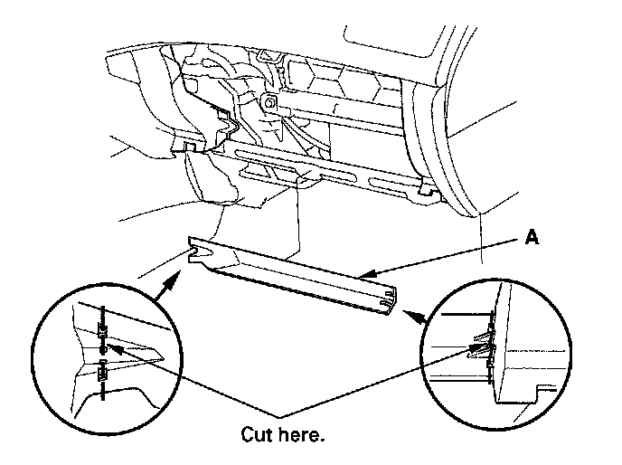2. Cut the plastic cross brace (A) in the glove box opening with diagonal cutters in the area shown, and discard it.