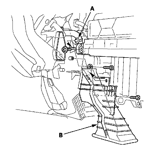 4. Remove the wire harness clip (A), the self-tapping screws, and the passenger's heater duct (B).