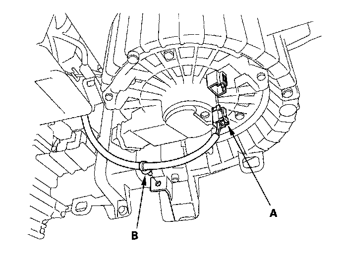 5. Disconnect the connector (A) from the blower motor. Remove the wire harness clip (B).