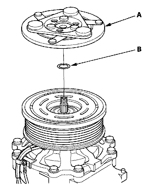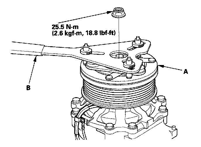 1. Remove the center nut while holding the armature plate (A) with a commercially available A/C clutch holder (B).