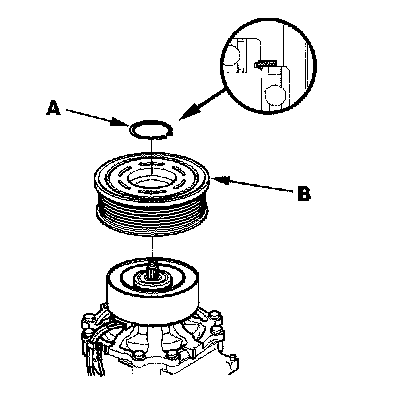 3. If you are replacing the field coil, remove the snap ring (A) with snap ring pliers, then remove the rotor pulley (B). Be careful not to damage the rotor pulley and A/C compressor.