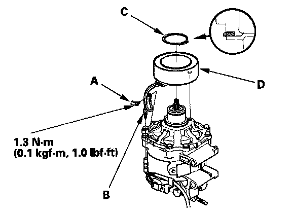 4. Remove the bolt and holder (A), then disconnect the field coil connector (B). Remove the snap ring (C) with snap ring pliers, then remove the field coil (D). Be careful not to damage the field coil and A/C compressor.