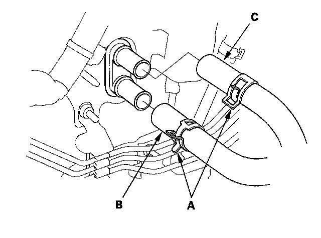 5. From under the hood, slide the hose clamps (A) back. Disconnect the inlet heater hose (B) and the outlet heater hose (C) from the heater unit. Note the orientation of the hoses.