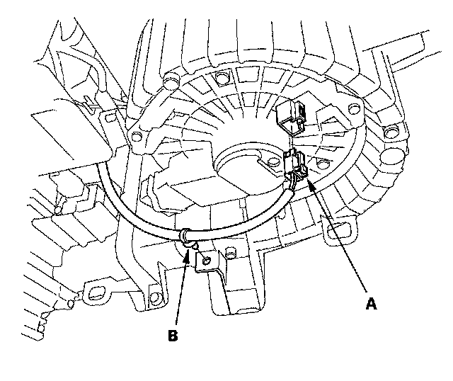8. Disconnect the connector (A) from the blower motor. Remove the wire harness clip (B).