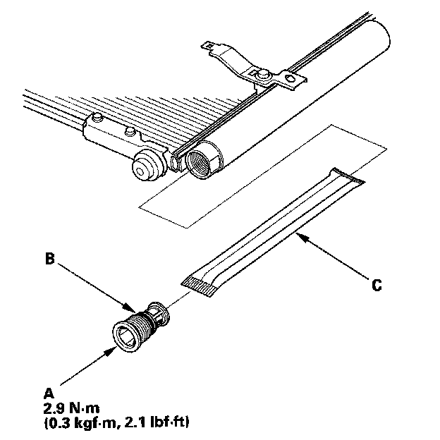 2. Remove the cap (A) from the bottom of the A/C condenser. Remove the O-rings (B) and the desiccant (C).
