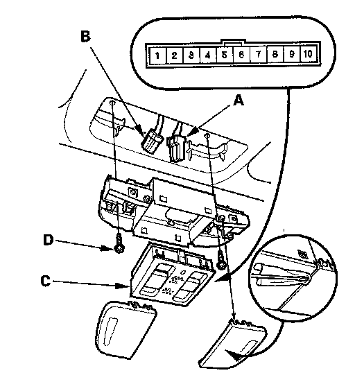 2. Disconnect the moonroof switch 10P connector (A) and map light 3P connector (B).