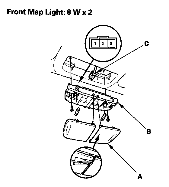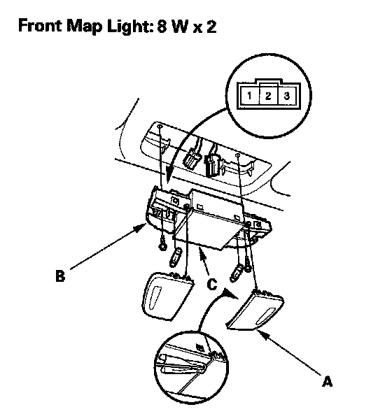 3. Remove the screws, then remove the map lights (B) and moonroof switch or navigation microphone (C).