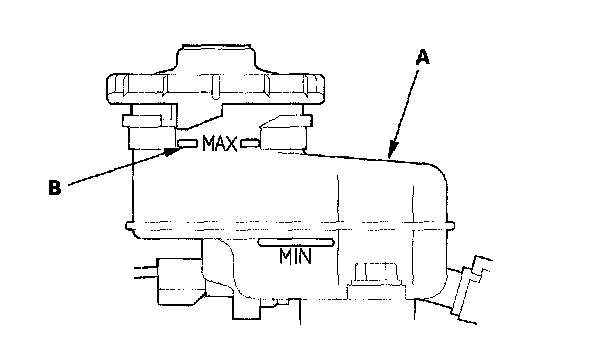 1. Make sure the brake fluid level in the reservoir (A) is at the MAX (upper) level line (B).