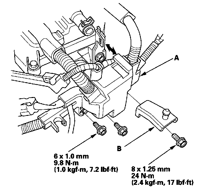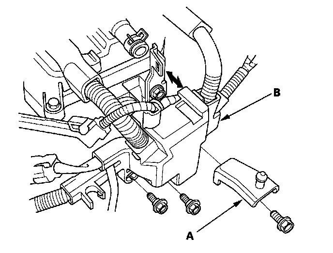 2. Remove the air cleaner housing bracket (A), then remove the harness holder (B) from the cylinder head.