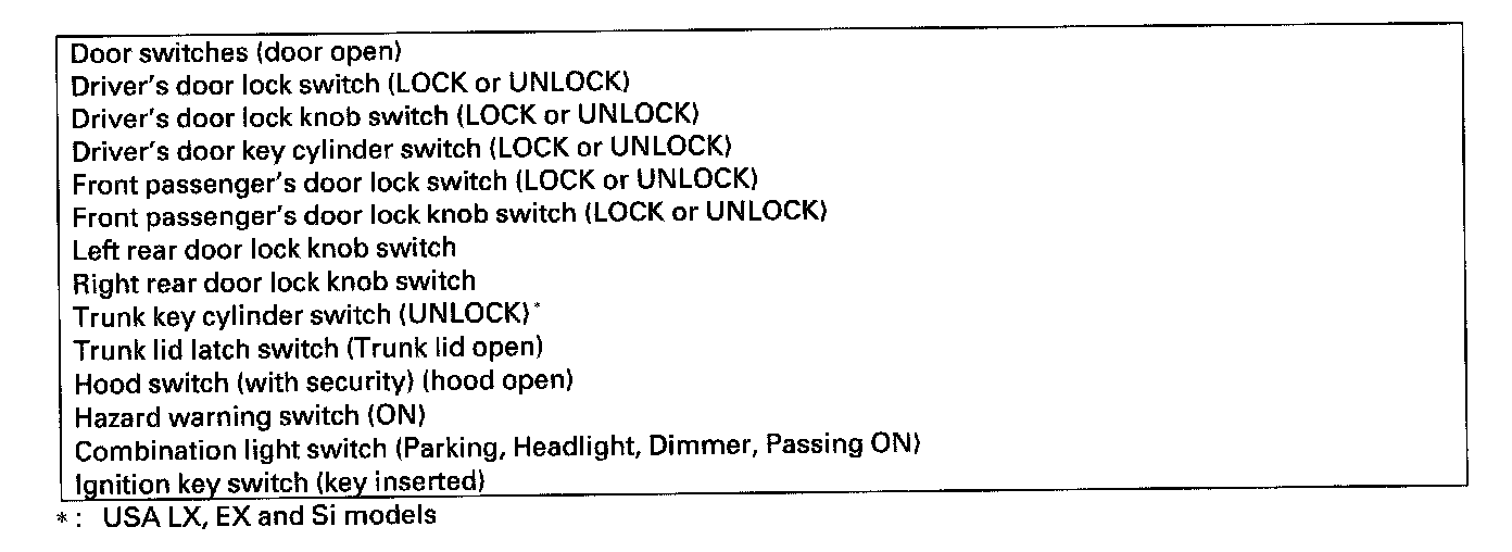 Turn the ignition switch OFF, and remove the key. If the MICU receives no signals from the inputs listed in the table given above, it will go into sleep mode in less than 40 seconds.