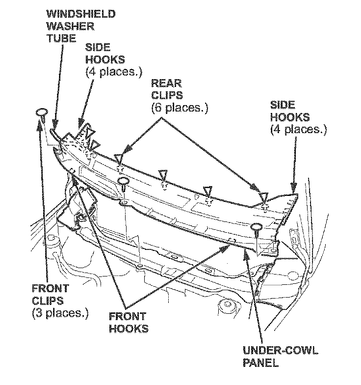 ^ Release the three front hooks from the edge of the under-cowl panel.