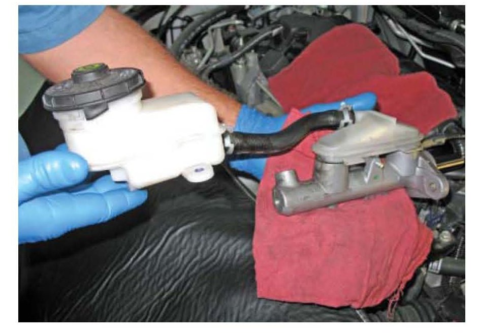 8. Remove the brake fluid from the master cylinder reservoir with a syringe.