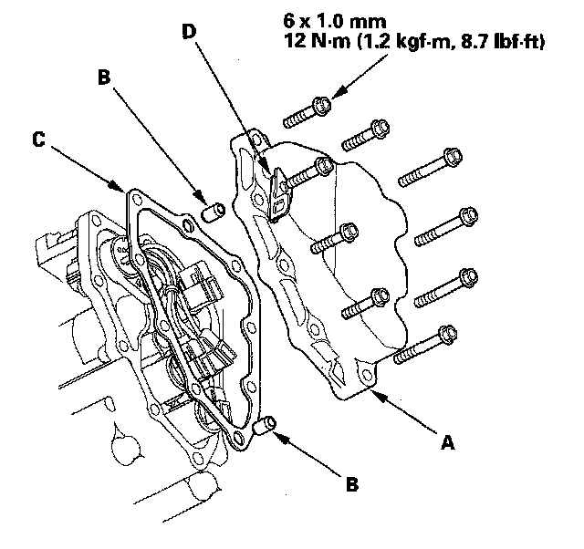 11. Remove the shift solenoid valve cover (A), dowel pins (B), gasket (C), and harness clamp bracket (D).