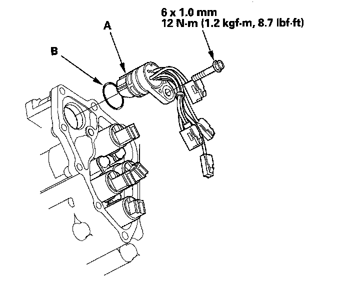15. Remove the shift solenoid harness connector (A), and replace it. Install a new O-ring (B) on the shift solenoid harness connector, and install the connector in the transmission housing, then go to step 21.