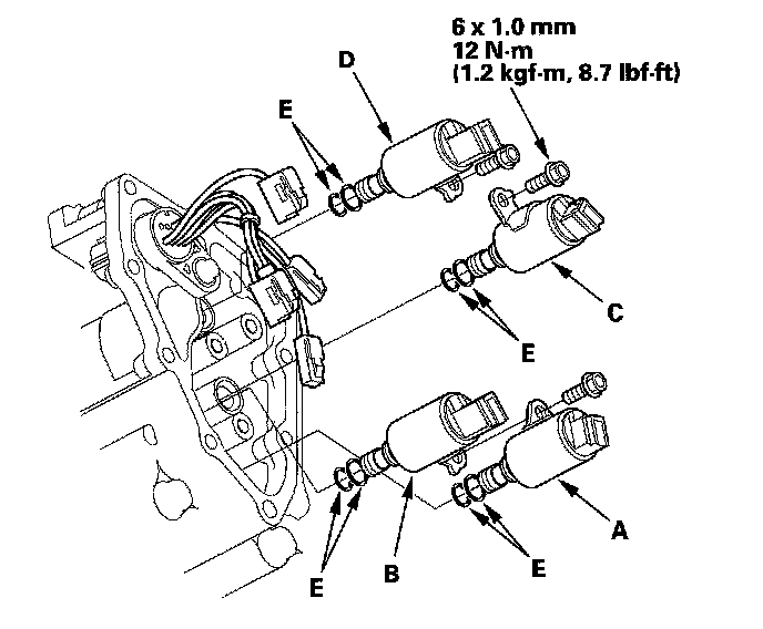 17. Install new O-rings (two O-rings per solenoid valve) (E) on the reused solenoid valve.