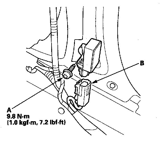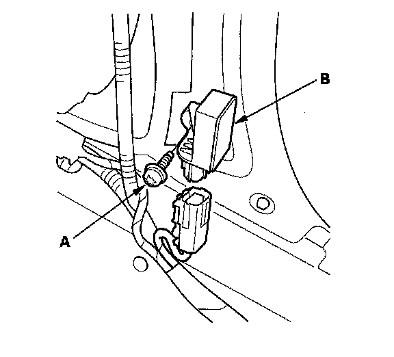 1. Install the new side impact sensor (first) with the TORX bolt (A), then connect the floor wire harness 4P connector (B) to the side impact sensor (first).