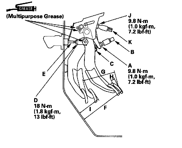 3. Loosen the clutch pushrod locknut (D), and turn the pushrod (E) in or out to get the specified height (F), stroke (G), free play (H), and disengagement height (I) at the clutch pedal.