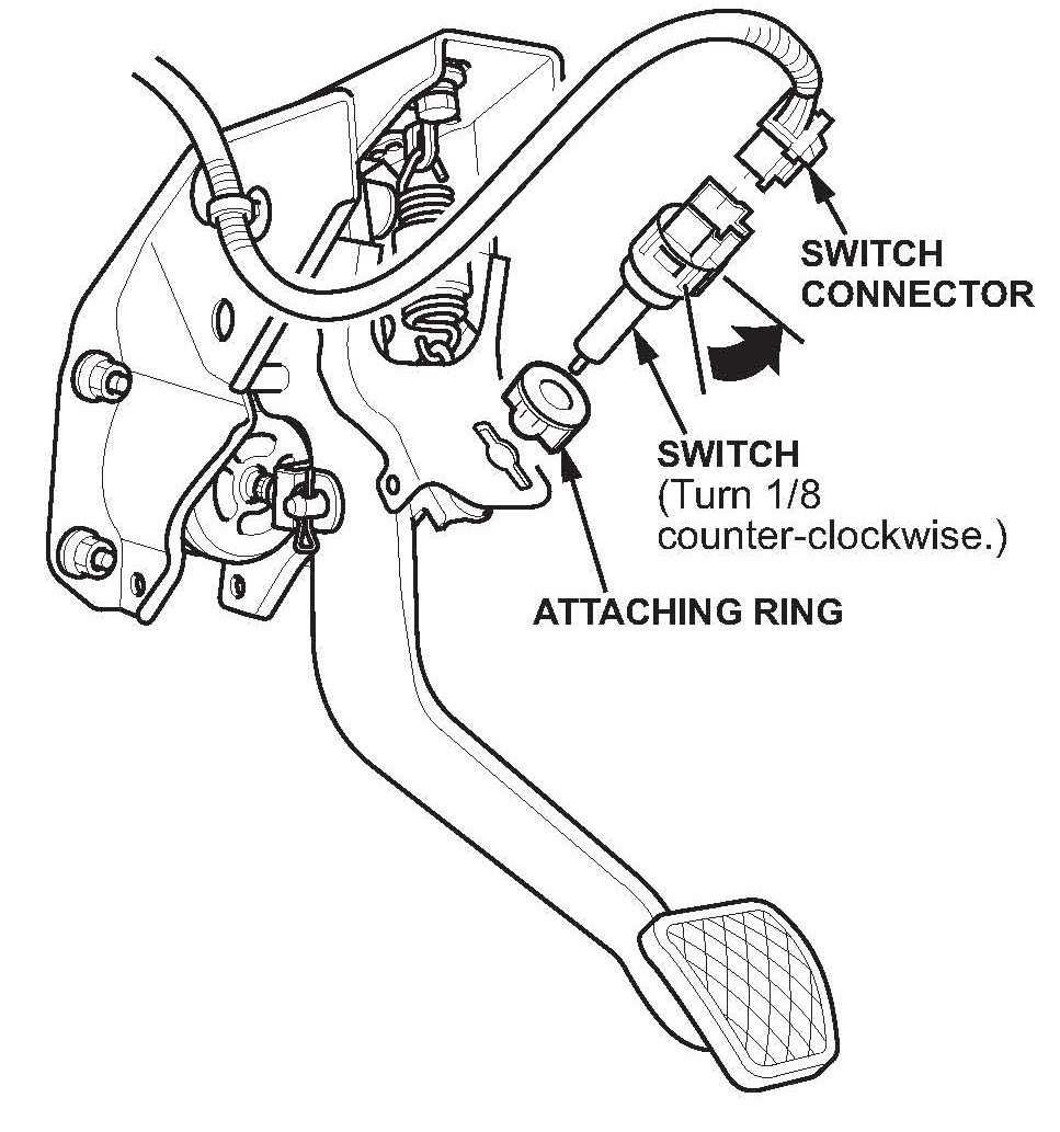 * ^ Use your hand to lift up on the brake pedal, then insert the switch into the attaching ring until the* end of the switch touches the top of the brake pedal. Twist the switch clockwise 1/8 turn to lock it into position.