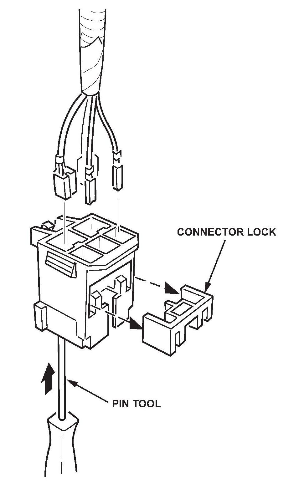 6. Using the pin tool, carefully remove the terminals from the back of the connector. The connector will *not be reused. For more information about terminal replacement: