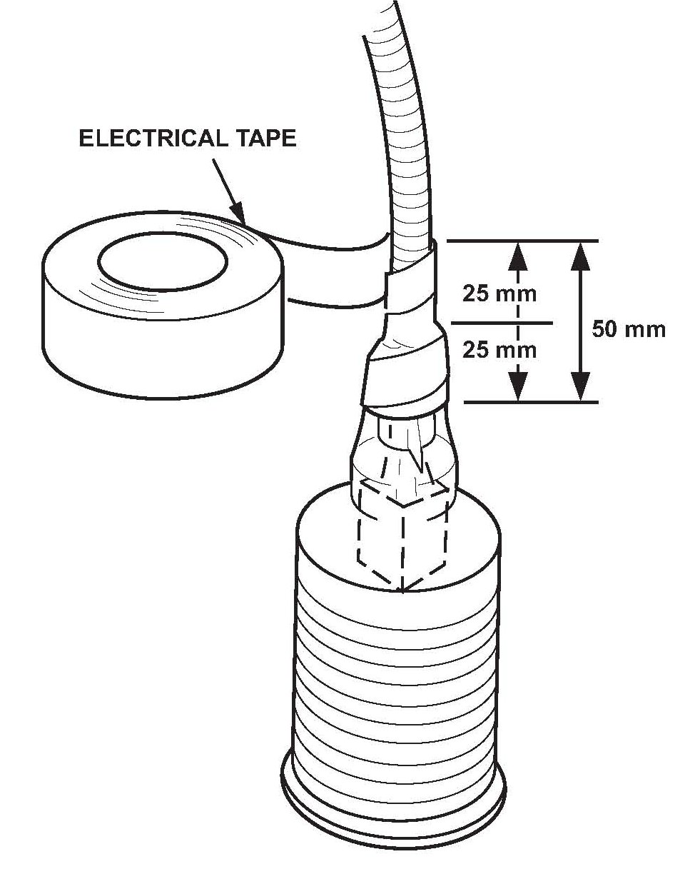 10. Pull the switch wires until the connector is in the small end of the switch boot. Using about 10 inches of electrical tape, tape the wires to the boot as shown.