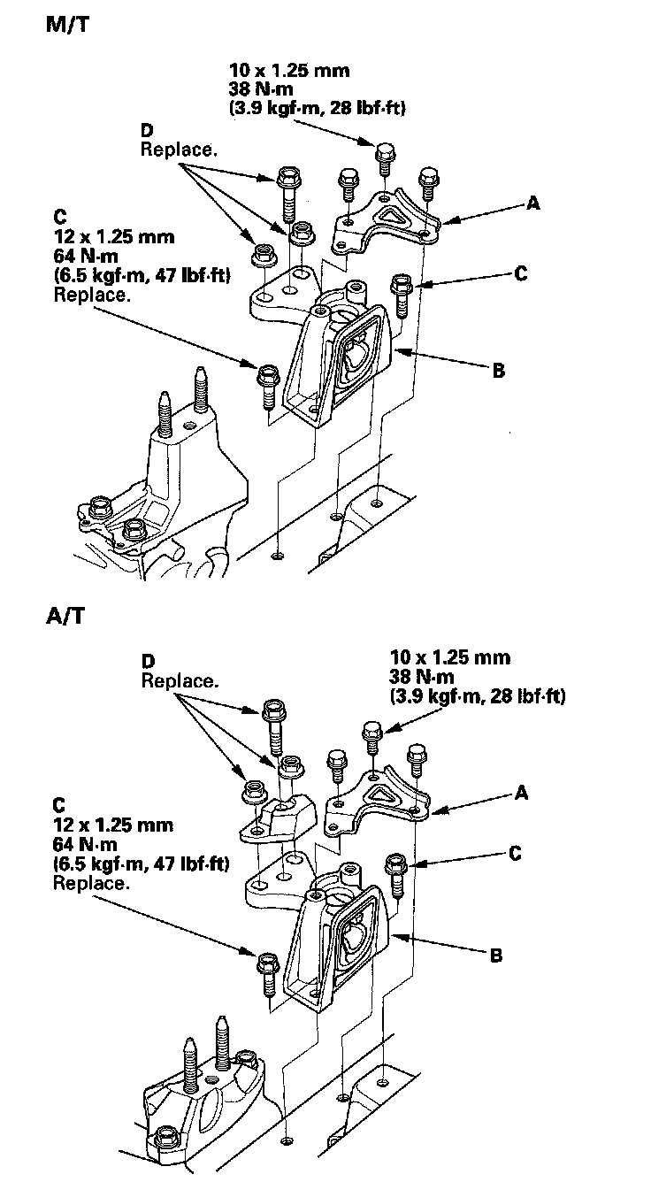 8. Install the transmission mount with the new mounting bolts (C), then install the transmission mount stiffener.