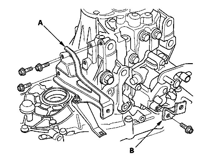 5. Remove the transmission hanger (A) and back-up light switch (B).