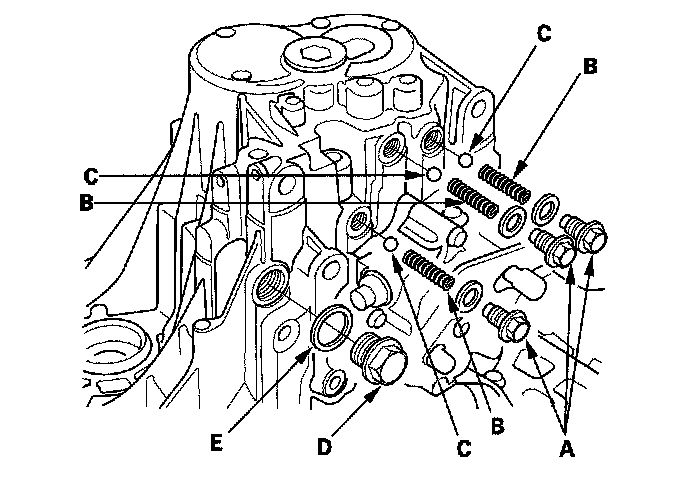 2. Remove the detent bolts (A), springs (B) and steel balls (C).