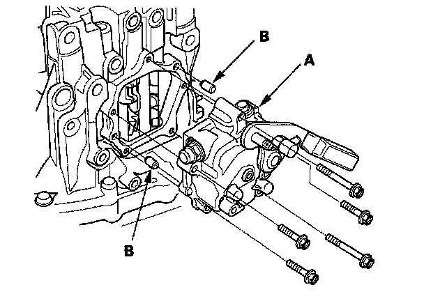 4. Remove the change lever assembly (A) and the 8 x 10 mm dowel pins (B).
