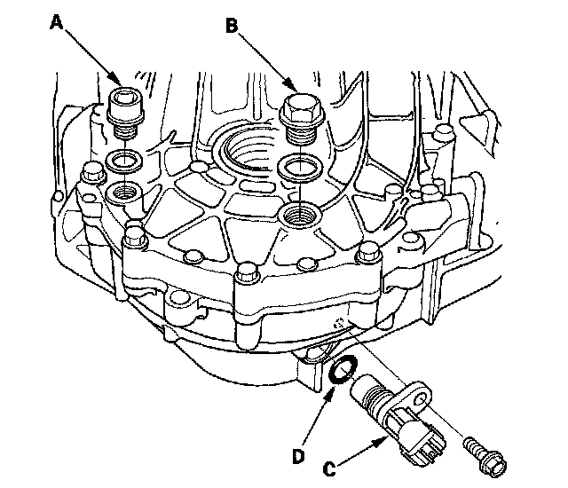6. Remove the drain plug (A), filler plug (B) and the output shaft (countershaft) speed sensor (C), then remove the O-ring (D).