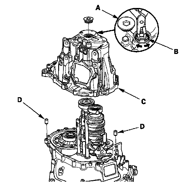10. Remove the transmission housing (C) and the two 14 x 20 mm dowel pins (D).