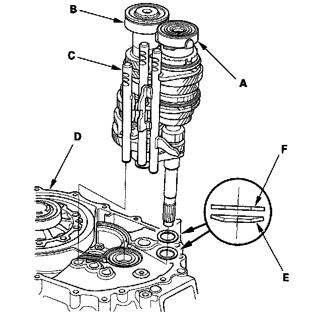 13. Apply tape to the mainshaft splines to protect the seal, then remove the mainshaft assembly (A) and countershaft assembly (B) with the shift forks (C) from the clutch housing (D).
