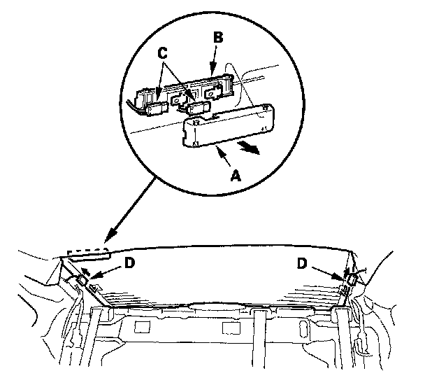 3. Disconnect the rear window defogger connectors (D).