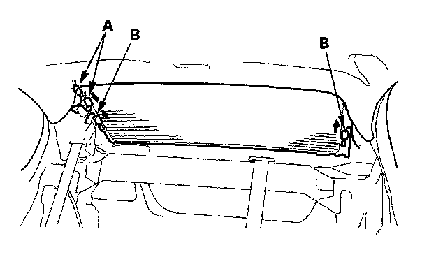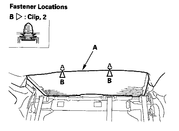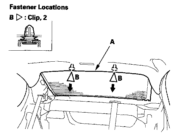 4. Pull down the rear portion of the headliner (A) by detaching the clips (B). Take care not to bend the headliner excessively, or you may crease or break it.
