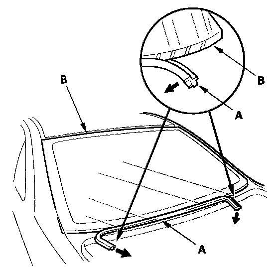 7. Remove the lower rubber dam (A) from the lower edge of the rear window (B). If necessary, cut the molding with a utility knife.