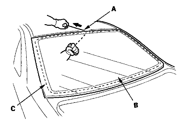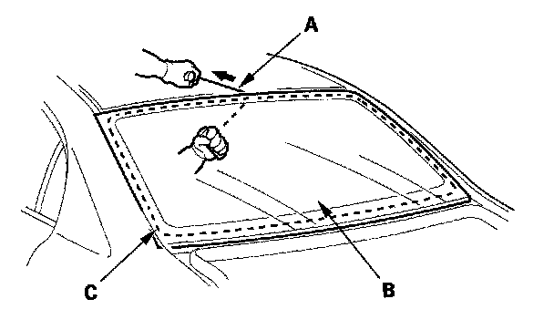 22. Pack adhesive into the cartridge without air pockets to ensure continuous delivery. Put the cartridge in a caulking gun, and run a bead of adhesive (A) around the edge of the rear window (B) between the dams (C) as shown.