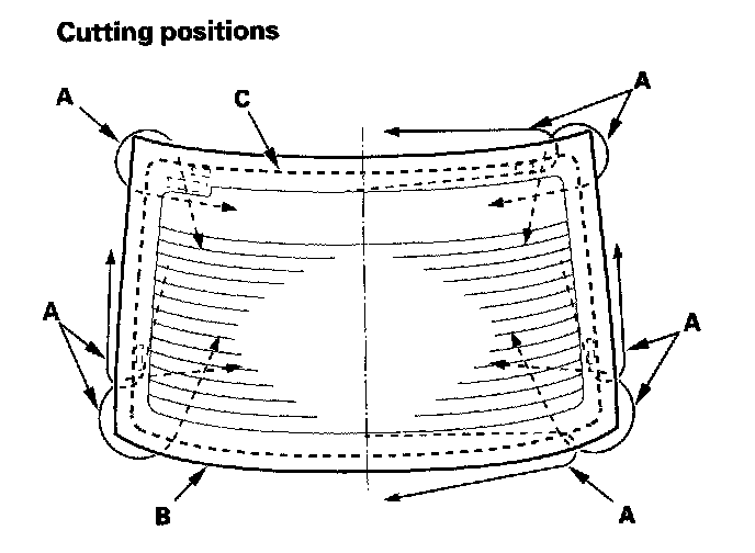 8. With a helper on the outside, pull the piano wire (A) back and forth in a sawing motion. Hold the piano wire as close to the rear window (B) as possible to prevent damage to the body, and carefully cut through the adhesive (C) around the entire rear window.