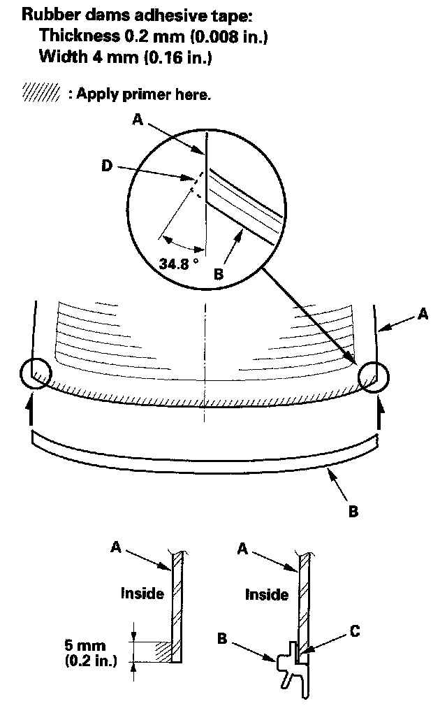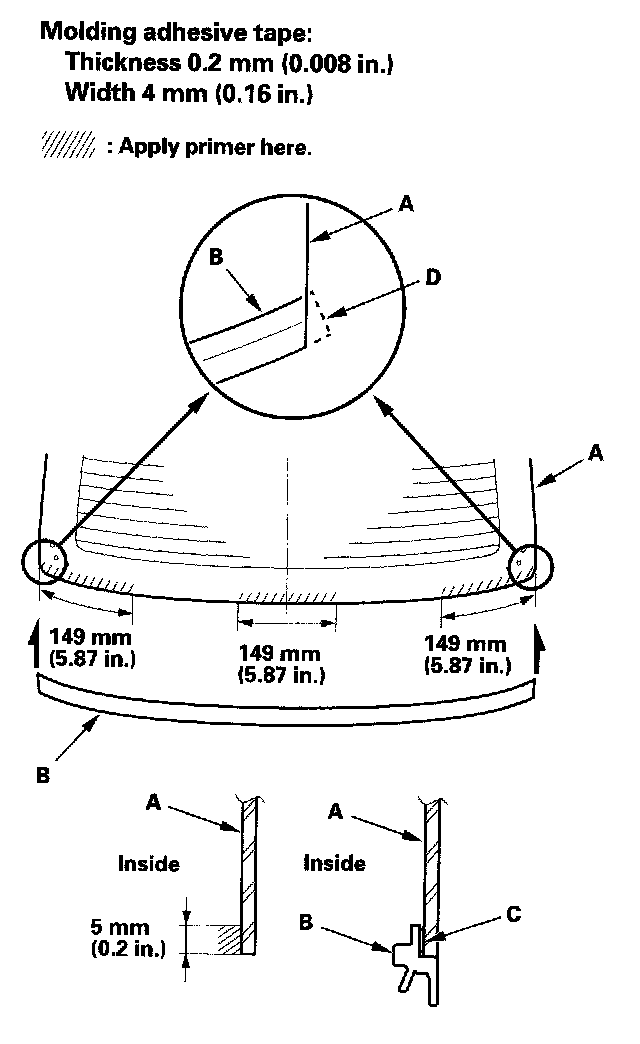 14. Apply primer to the edge of the rear window (A) where the lower rubber dam adhesive tape will be attached as shown. Attach the lower rubber dam (B) with adhesive tape (C) to the lower edge of the rear window: