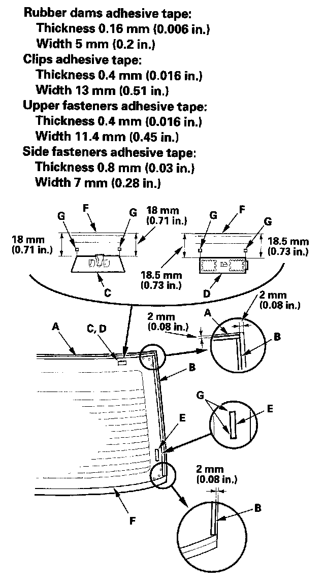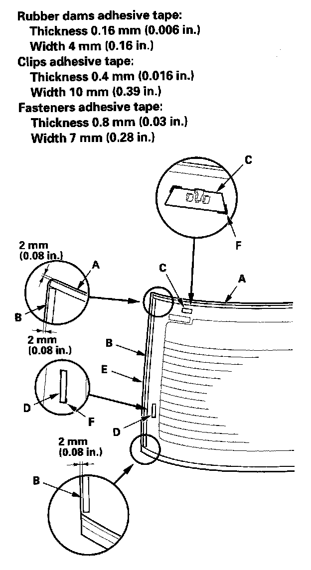 13. Attach the upper rubber dams (A), side rubber dams (B), clips (C) (except USA produced models), upper fasteners (D) (USA produced models), and side fasteners (E) with adhesive tape to the inside face of the rear window (F) as shown: